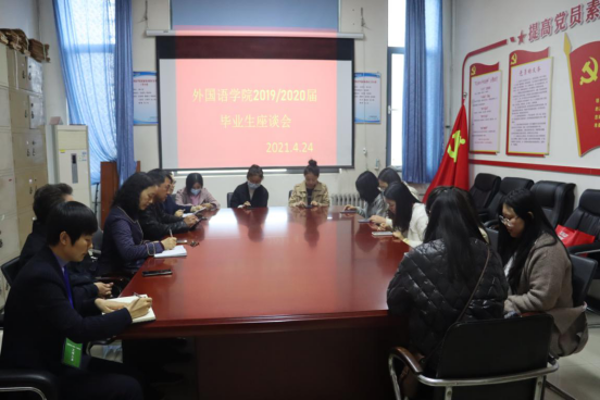 2021年4月24日,外国语学院近百名毕业生返校参加专业八级考试。考试结束后,外国语学院趁此之机在公教楼403和407先后组织了气氛热烈、感情真挚的师生见面会和座谈会。此次见面座谈会的目的,一是成立毕业生微信群,搭建起毕业生与母校的信息沟通桥梁,便于对毕业生跟踪反馈工作的进行。二是开展座谈,调研毕业生工作学习状况,了解毕业生需求,助力师范认证背景下外院人才培养目标合理性调查。外国语学院张成起书记、刘彦芬院长、李树学院长、赵清丽和张旸老师等人参加了这次见面会。
