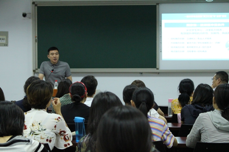 作为改革前期准备系列培训工作之一,7月7日,外国语学院邀请吉林外国语大学外语部院长李英涛博士来我校做了题为“人才培养国际化背景下的大学英语‘分类+分级+分段’培养模式研究与实践”的讲座。讲座内容包括四个部分:1、翻转与混合的背景,包括一流本科专业建设与金课建设,大学外语教学与国际化,新时代大学外语教师的使命,当代大学生的学习特点;2.对翻转和混合的新理解;3.人才培养国际化背景下的大学外语“分类+分段+分级”人才培养模式研究与实践;4.翻转与混合的课程案例。