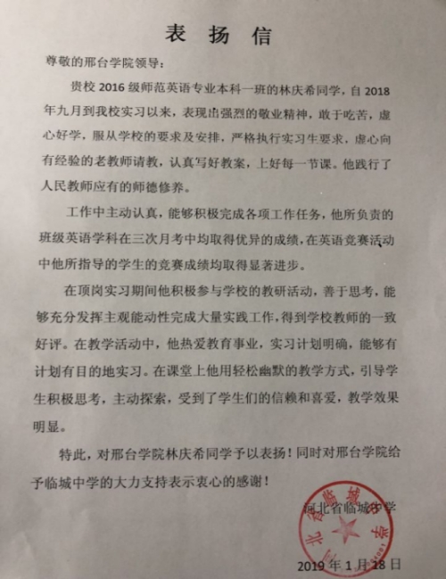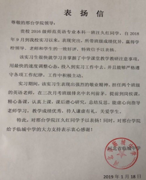 时值本学期顶岗支教实习工作接近尾声之际,我院收到了来自临城实习基地的两封表扬信,对我院2016级英语专业本科1班的顶岗支教实习生汪久红、林庆希两位同学在临城中学实习期间的良好表现,给予了积极地肯定和真诚地表扬。