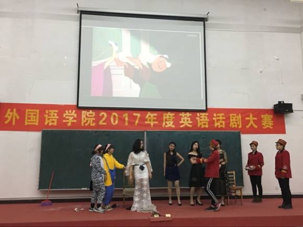 经过几年的摸索和实践,由英语语言文学教研室组织的英语话剧大赛,已经成为最受英语专业师生欢迎的比赛之一。今年的英语话剧大赛在院领导的大力支持下从比赛场地、音响设备等方面进行了全面升级,得到外国语学院全体师生的普遍关注,同学们积极报名比赛,积极献言献策参与比赛筹备。各个参赛话剧小组从服装、道具、音响、背景音乐与动画等方面做了充分的准备,比赛取得了良好的效果。