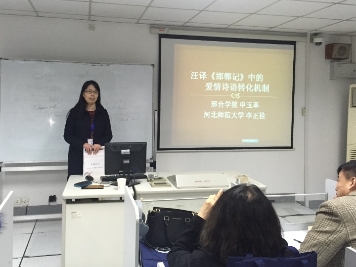 我院申玉革老师作为与会代表,在“典籍翻译家研究”专题研讨会上做了“汪译《邯郸记》中的爱情诗语转化机制”的精彩发言。汪榕培教授翻译出版的《邯郸记》(2003)是第一个也是迄今为止唯一的英译本。目前学界对汪译《牡丹亭》关注较多,对该译本关注甚少。作为河北的学人,选择这样一个译本作为切入点是我们的责任和义务,对河北的外宣翻译也有一定的助益。申玉革老师结合自身关于河北省外宣翻译的课题研究,从汪教授“传神达意”的翻译思想入手,探讨汪译本对汤显祖《邯郸记》中爱情诗语的转换机制,指出汪译《邯郸记》对爱情诗语的转换不盲目恪守“忠实”的原则,致力于采用翻译补偿、意象置换等原则达到“传神达意”的效果,译本既不违背原语的主旨思想,又保留了译语的文学性和可读性,是原作风格的创造性再现。申玉革老师对汪译《邯郸记》的研究和关注得到了在座专家和汪老弟子的认可。