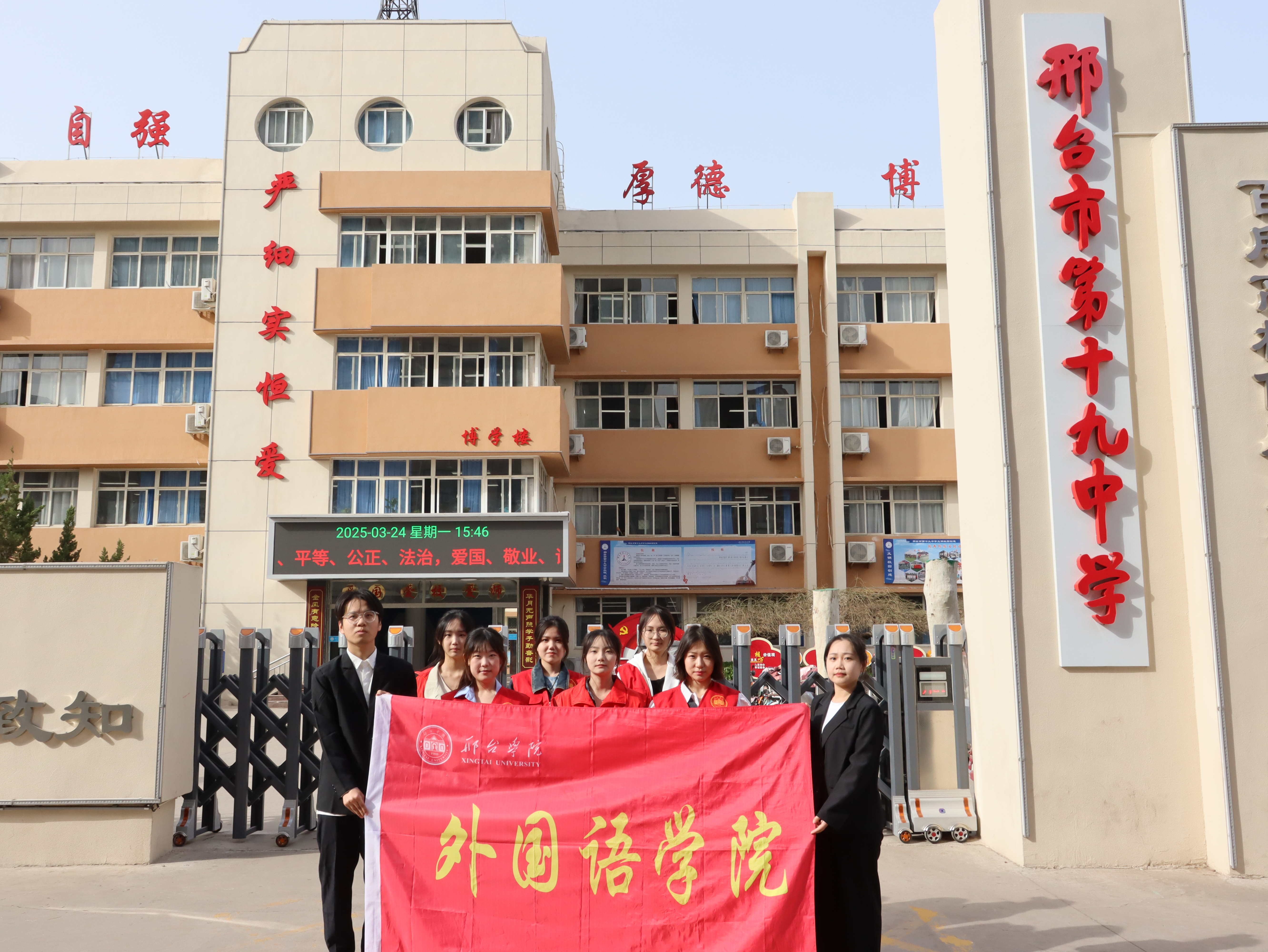 2025年3月24日,邢台学院外国语学院团委负责人陈闯、辅导员王岚、专业教师张旸三位指导老师带领10名外国语学院的优秀学生志愿者在邢台市第十九中学,开展了一场别开生面的双语宣讲志愿服务活动。