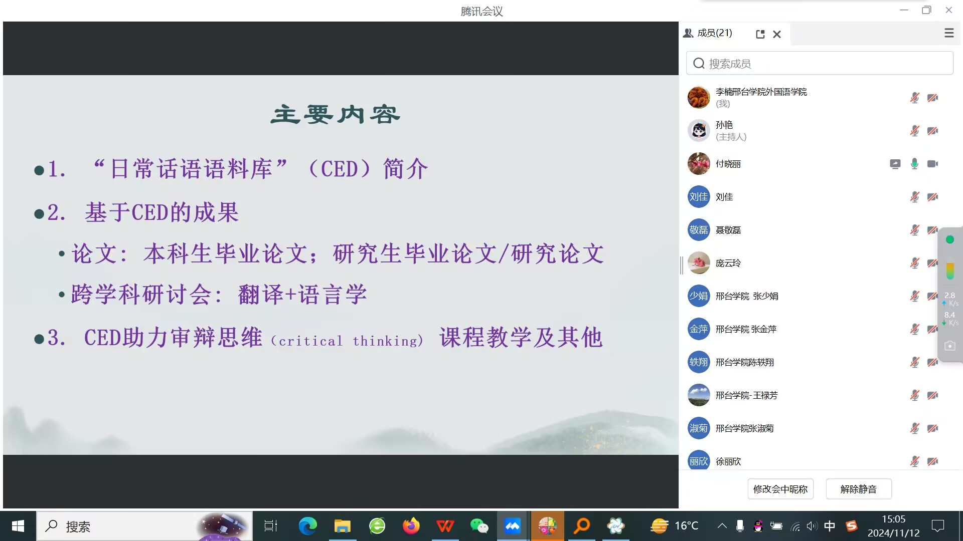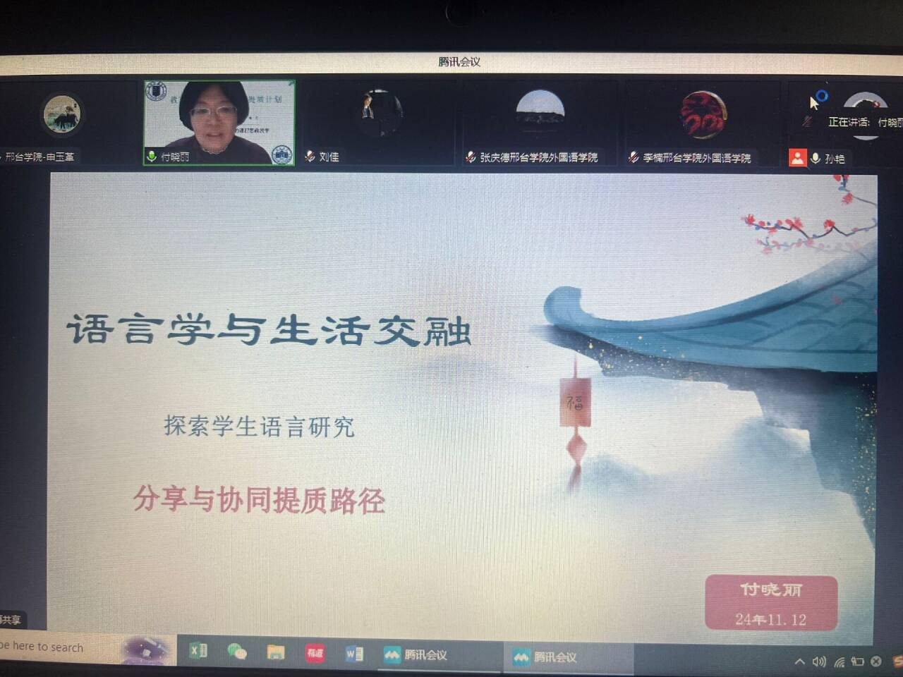 近日,邢台学院语言文学教研室与河北师范大学外国语学院英语系英语语言学教研室通过线上会议平台(腾讯会议号:124-987-096)成功开展了一次协同教研活动。此次活动旨在探讨语言学与生活交融的新路径,以及如何通过学生参与语言研究促进教学质量协同提升。