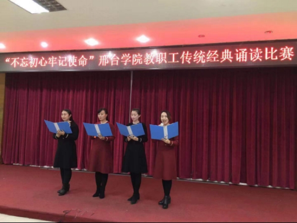 由邢台学院校工会主办的“不忘初心 牢记使命”教职工传统经典诵读比赛于12月9日下午在图书馆多功能厅隆重举行。全校21个分工会代表队参加了比赛,校党委副书记赵建彬,校工会常务副主席王士华、副主席张荣霞亲临现场,为各代表队加油助威。 我外国语学院分工会也选派杜淑平、张旸、王博、张伟四位老师组成代表队参赛。