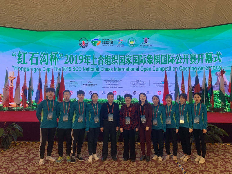 9月19日上午,2019年上合组织国家国际象棋国际公开赛开幕式在邢台沙河市红石沟生态农场开幕。外国语学院党委书记沈宪敏率带队教师崔恒秒、英文主持人王瑞老师和8名学生翻译志愿者参加了开幕式。