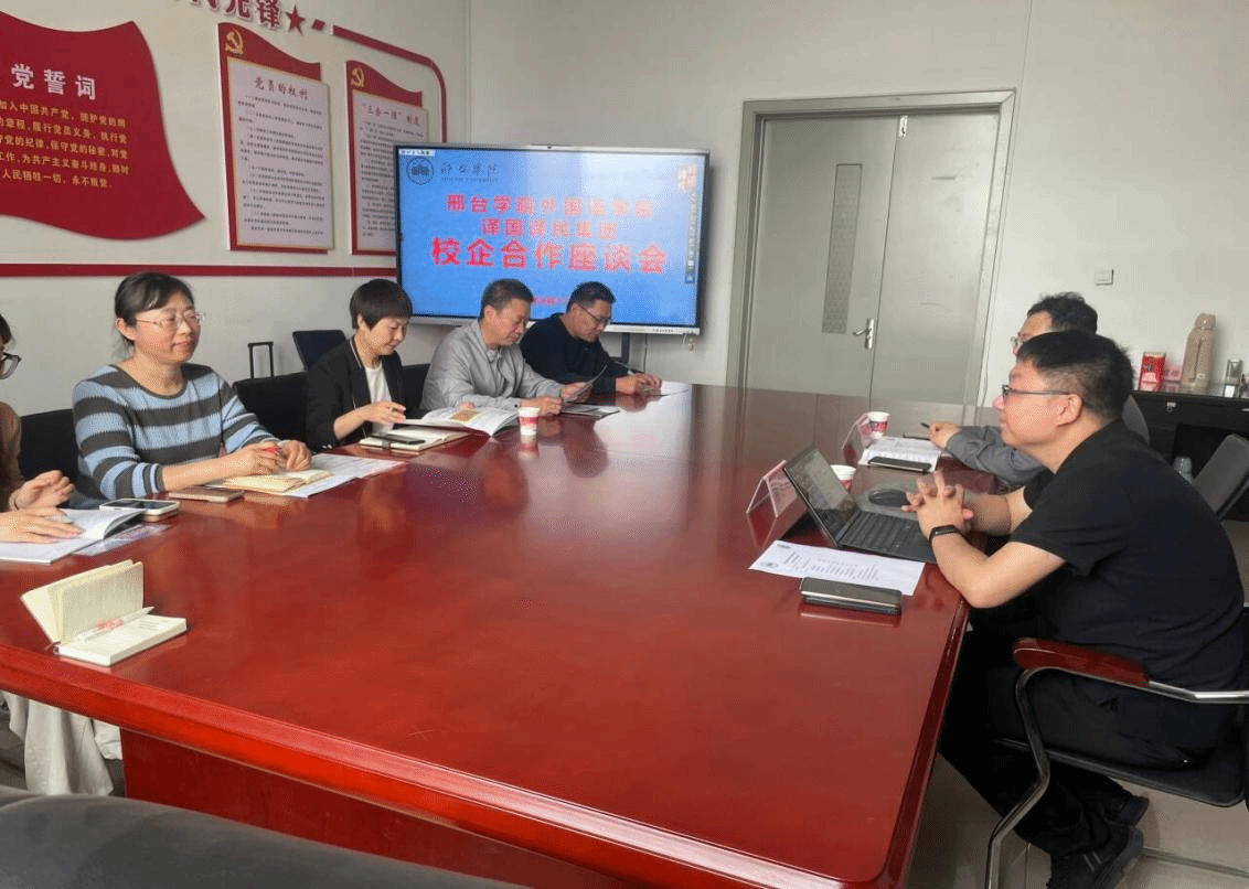 2025年4月17日上午,邢台学院外国语学院与译国译民集团在学院407会议室举行校企合作座谈会,双方就深化合作事宜展开深入交流。此次会议由外国语学院副书记孟贵祥主持,院长赵清丽、译国译民集团华北区总经理王晓飞等双方代表出席。
